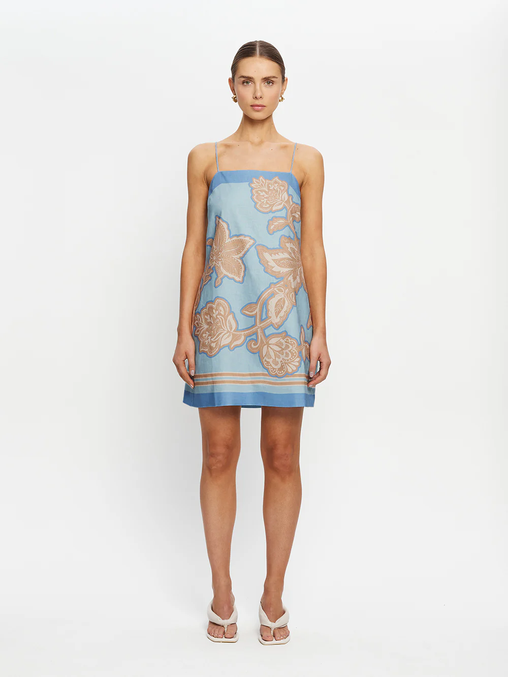 Create an accountCoco is a soft botanical print featuring blush-toned florals set against a light blue base. The Coco Shift Mini Dress features a straight neckline and fine straps that tie at the lower back, accented with contrast border print detailing throughout.