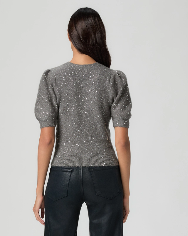 Create an accountThe Gladiolus Sweater in grey is crafted from Pailettes yarn with sequins throughout for a touch of sparkle. This crew neck sweater features half puff sleeves, created a chic, feminine silhouette.