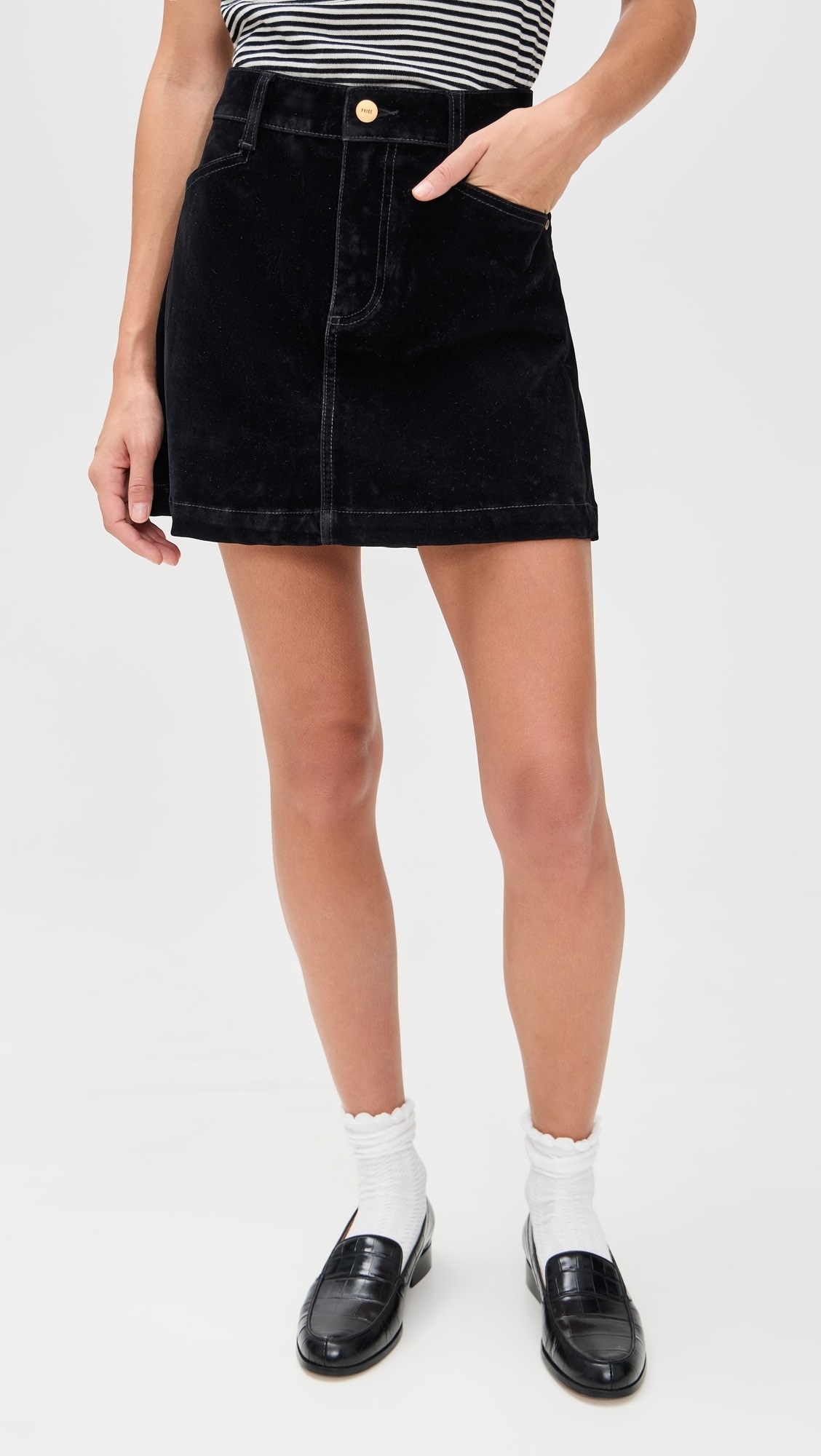 Create an accountVelvet mini skirt with a button front and fly closure.