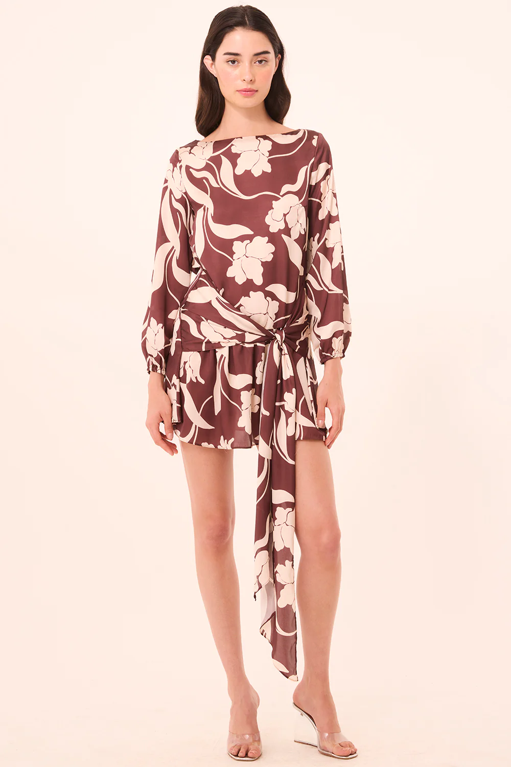 Create an accountLarissa is a satin mini dress cut from a cream and chocolate floral print. This effortless shift silhouette features long blouson sleeves with elastic cuffs and a boat neckline. A wide sash cinches the waist, tying at the side to create a faux-wrap effect.