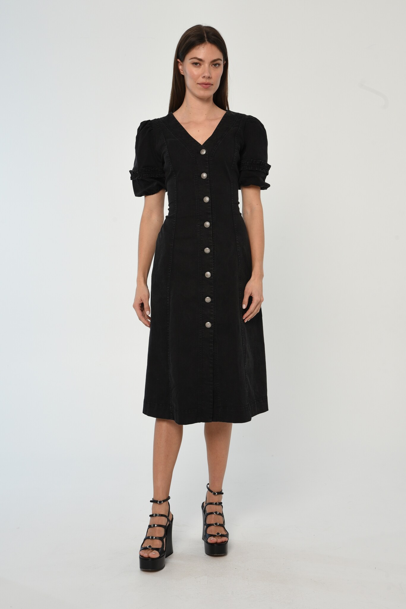 Create an accountShort sleeved denim midi dress with panel and ruffle details.