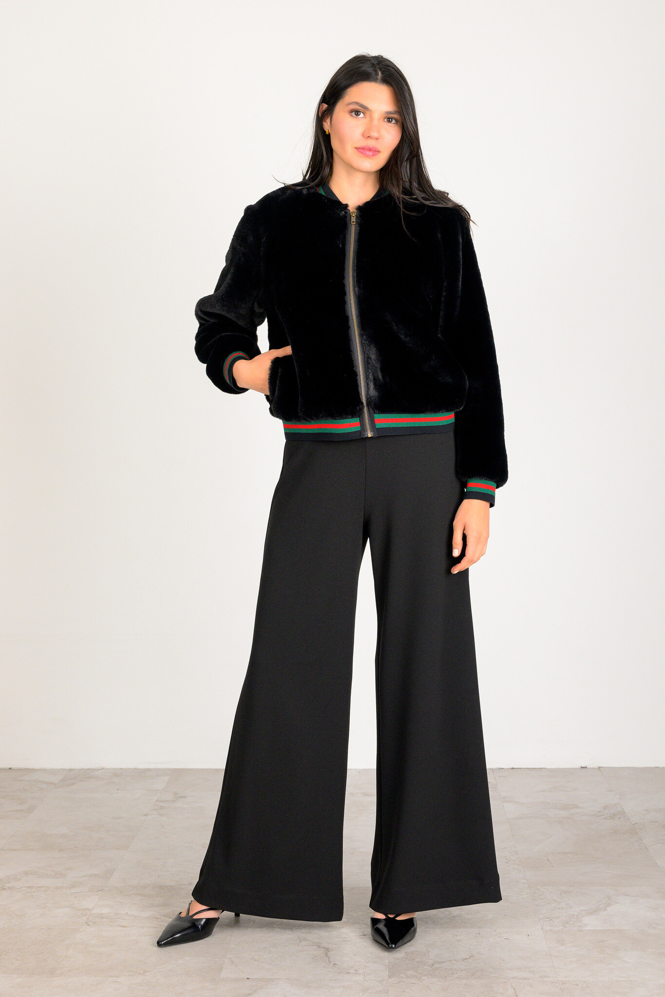 Create an accountFuzzy zip up bomber jacket with a contrast stripe trim.